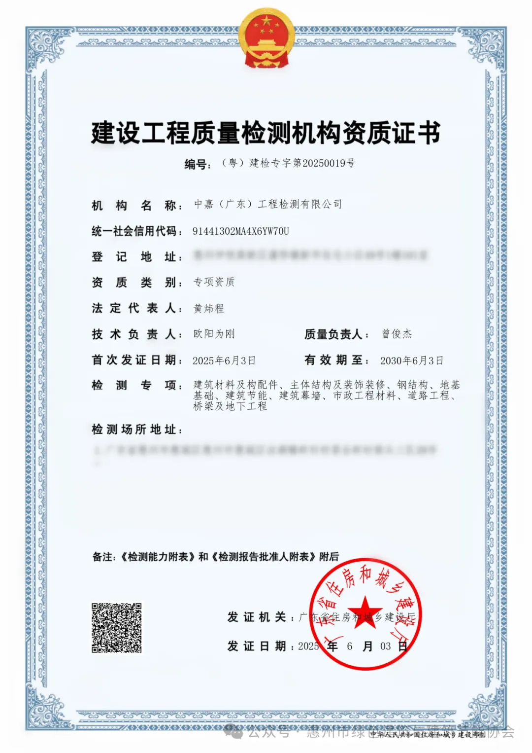 近日,中嘉(广东)工程检测有限公司成功获得惠州市首家建设工程质量检测机构资质证书,资质范围全面覆盖建筑材料及构配件、主体结构及装饰装修、钢结构、地基基础、建筑节能、建筑幕墙、市政工程材料、道路工程、桥梁及地下工程九大全项领域。标志着中嘉检测在建设工程质量检测领域的综合实力再上新台阶,开启了建设工程质量检测新篇章。